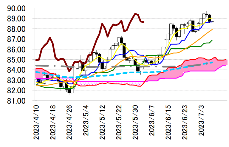 た。本日は転換線 88.65 円を念頭に置き、6 月 29 日の安値を