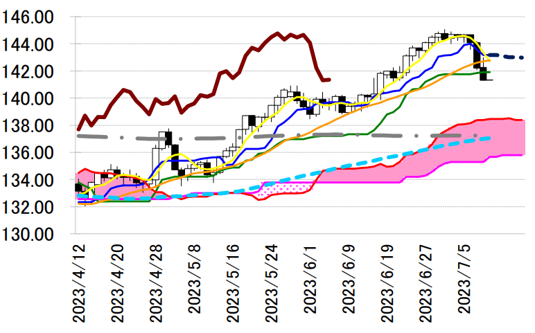 サポートが期待された一目・基準線 141.92 円も下抜けて