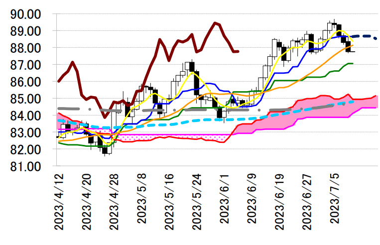 日線が重しとなるか。6 月 21 日安値 87.12 円や同 20 日安値