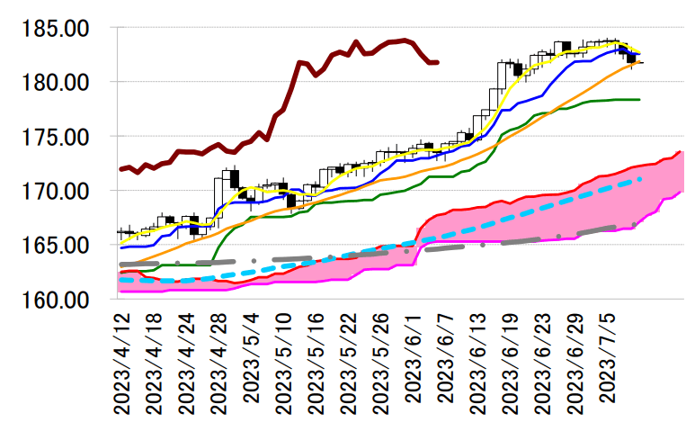 陰線引け。一目均衡表・転換線 182.56 円付近から下放れ、