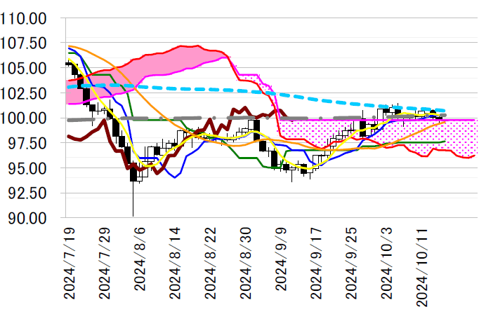 上回り、雲の上限99.76 円で引けているものの、買いシグナ
