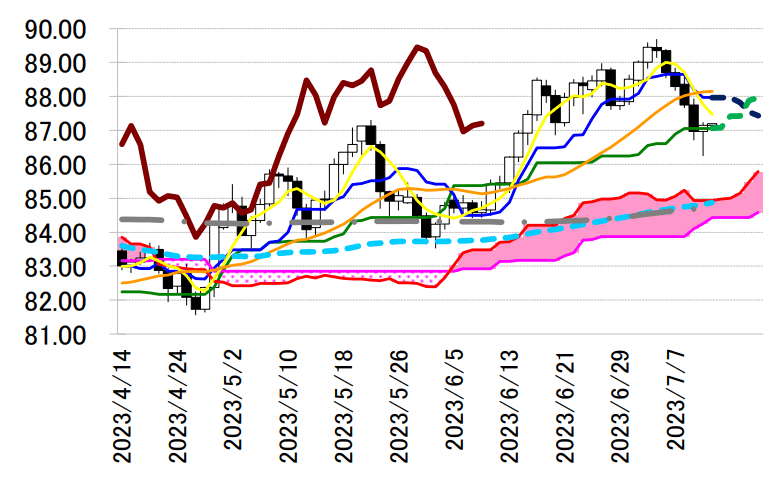 の動きに沿って、基準線と転換線の交差が予想される 87 円