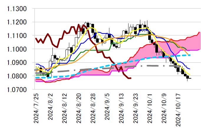 平均線にもとどかない。低下中の一目均衡表・転換線1.0852