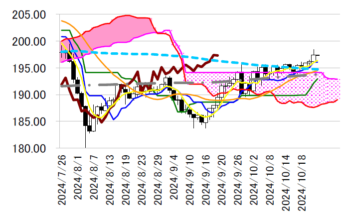 均線(本日196.38 円前後)の上昇をともなう上向きの流れ