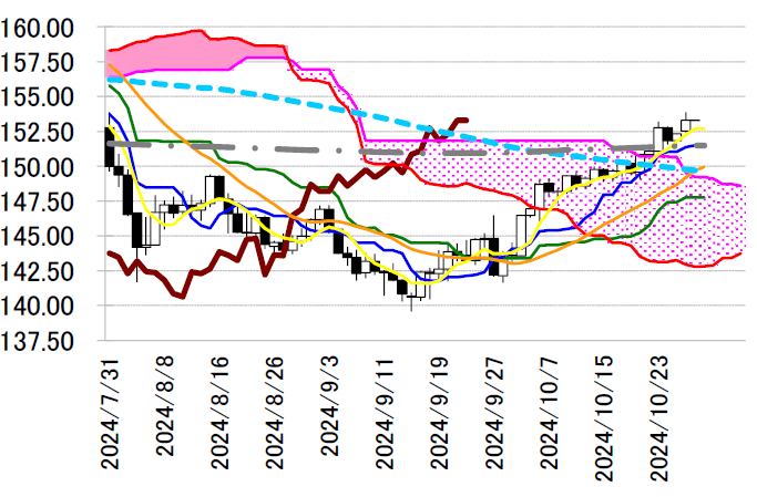 昨日のドル円は153.88円まで上昇し、7月31日の植田ショックの時の高値に面合わせした。衆議院選挙 で自民・公明の政権与党が過半数を確保出来なかったことを受け、政治的な不確実性が高まる中、日本 銀行は、早期の追加利上げに踏み切ることはできないだろうとの思惑から円売りが進んだ。