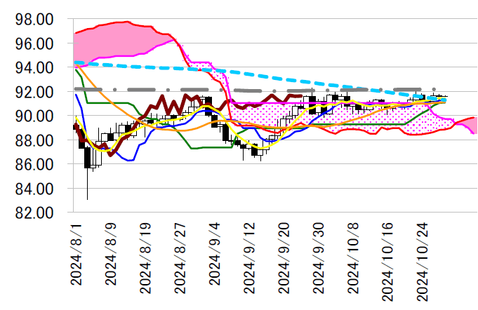 本日は91.31 円に上昇している転換線を念頭に置き、基準