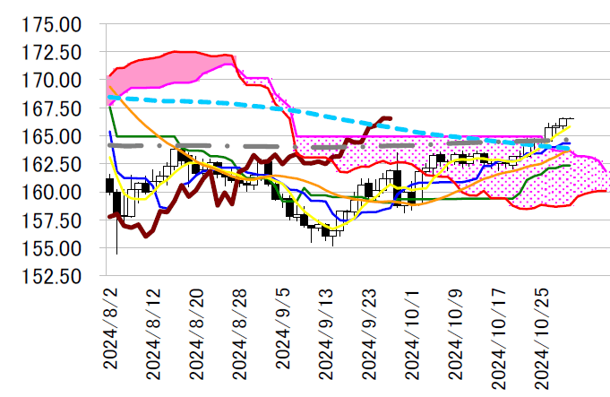 ポンドドルは荒い値動き。7月の総選挙での政権交代後、初となる労働党による予算案発表を前に警戒 売りが先行し、一時1.2937ドルまで下落した。リーブズ財務相が発表した予算案では国民保険料の引き 上げなどで400億ポンド規模の増税が明らかになった。また、予算責任局(OBR)が発表したインフレ目 標が上方修正されたことで英利下げ観測が後退し、英長期金利の上昇とともにポンド買いが優勢に。一時 1.3043ドルまで買い上げられたが、それでも利下げを期待する向きは依然として根強く、一巡すると 1.2960ドル台まで押し戻された。