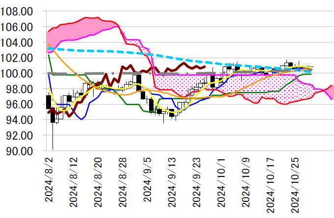 が点灯中。孕み線で反発して転換線100.82 円をわずかに上