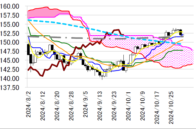 151.49 円から本日時点の152.19 円に上昇してきた転換線を