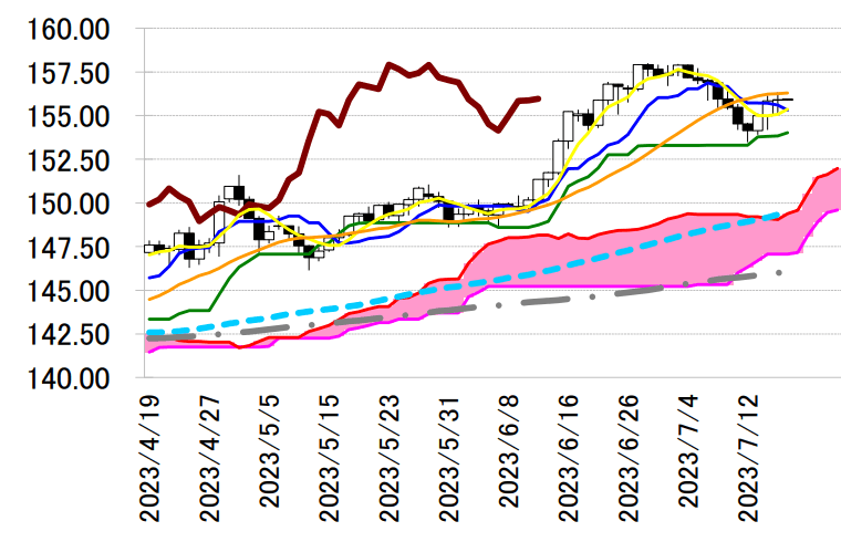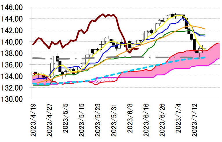 ドル円の攻防の分岐点としては、日足一目均衡表・雲の上限 138.40 円を注目しておきたい。