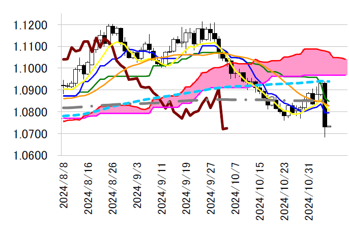 ユーロドルは3日ぶりに反落。終値は1.0729ドルと前営業日NY終値(1.0930ドル)と比べて0.0201 ドル程度のユーロ安水準だった。トランプ氏の当選が確実になると米財政拡大やインフレ圧力の増大につ ながる政策が進みやすくなるとの観測から米長期金利が急騰し、為替市場ではドル全面高の展開に。22 時過ぎに一時1.0683ドルと6月27日以来の安値を更新した。米長期金利の指標となる米10年債利回り は一時4.4768%前後と7月1日以来約4カ月ぶりの高水準を記録した。ただ、急ピッチで下落した反動 で利益確定目的のユーロ買い・ドル売りなどが入ると下げ渋った。米30年債入札後に米長期金利が上昇 幅を縮小した影響もあり、3時30分前には1.0758ドル付近まで下げ幅を縮めた。