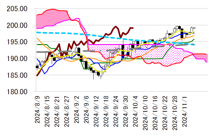 く拡大するも、10 月30 日高値199.81 円を前に上昇は一服。