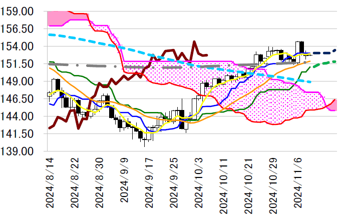 小陰線引け。一目均衡表・転換線153.01 円を下回る水準