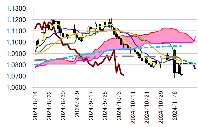 1.0687 ドルまで急落した。低下中の一目・基準線1.0840 ド