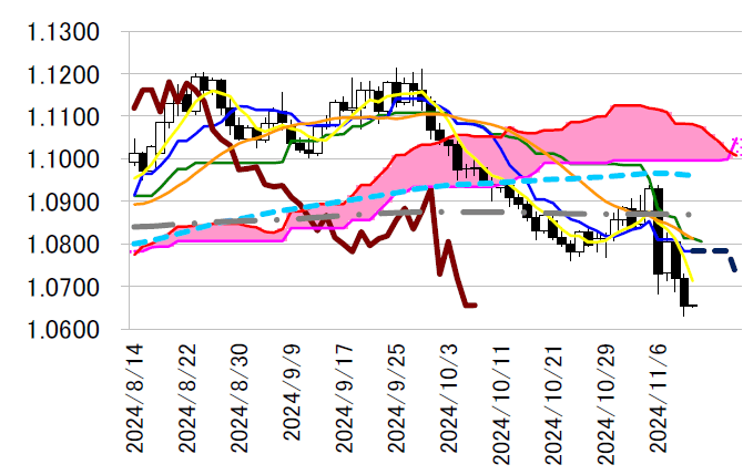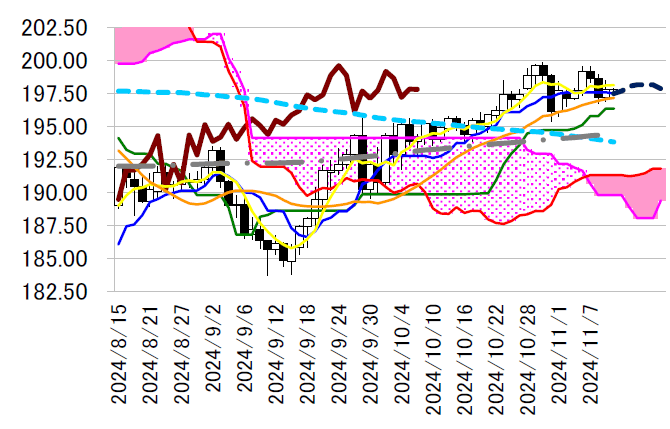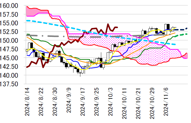 昨日のドル円は、ニューヨーク市場がベテランズデーのため債券市場が休場となり、ドル買い要因とな ってきた米中長期債利回りの上昇という材料がなかったものの、ドル全面高の展開の中で153.95円まで 上昇した。ドル円は、上昇基調にある200日移動平均線を支持帯にして、トランプ・トレードにより上値 を探る展開が続いている。