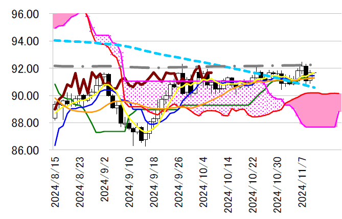 準で推移している。一目均衡表・基準線91.27 円や上昇が見