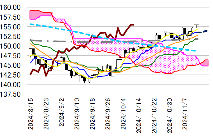 米10月コアCPIが3カ月連続で前月比+0.3%の伸びを記録してインフレ抑制の足踏みが警戒されたこ とで、米10年債利回りが4.46%台まで上昇し、ドル円も155.62円まで上昇して、トランプ・トレード が継続している。