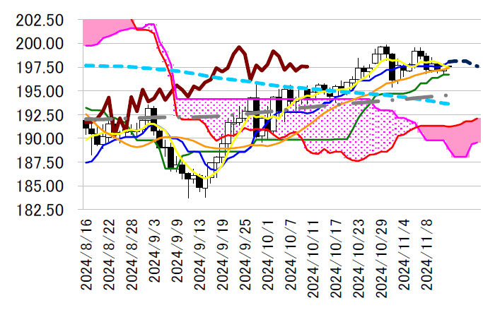 基準線196.70 円をやや下回る同水準からは戻し、一目・転