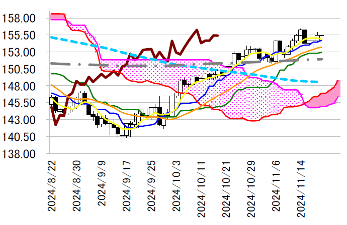 陽線引け。上向きの日足一目・転換線が支持となり155 円