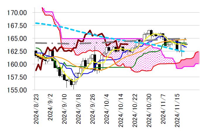 先週末に一目・基準線を下回った転換線は、163.20 円台ま
