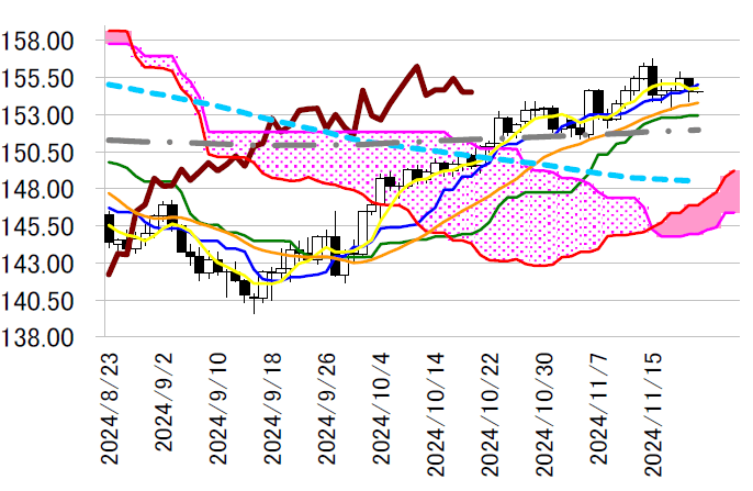ウクライナ情勢に関しては、ウクライナ軍は19日に米国製地対地ミサイルでロシア領を攻撃し(※下 値153.29円)、20日には英国製長距離ミサイルでロシア領内の軍事施設を攻撃した(※下値155.06円)。