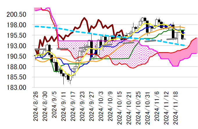 本日は194.70 円台で上向きの200 日線を念頭に置いた取