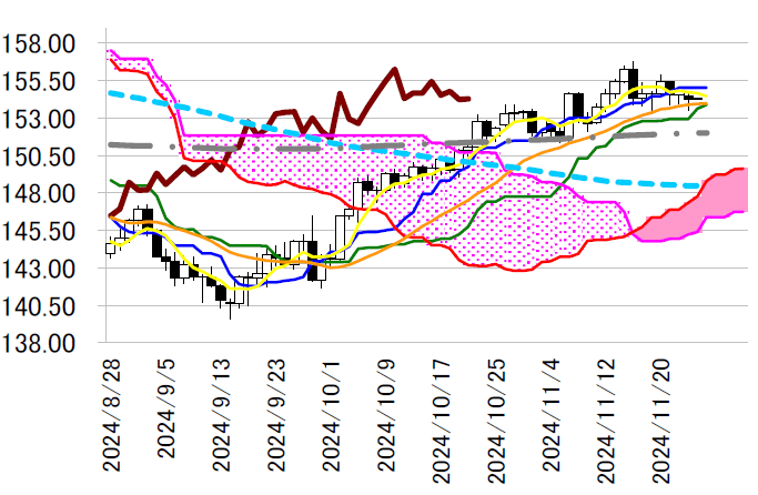 日足一目・基準線は本日153.60 円台まで上昇し、週後半