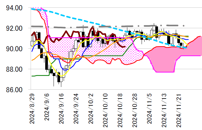 野に入る。上サイドは90 円後半の転換線が目先のポイント。