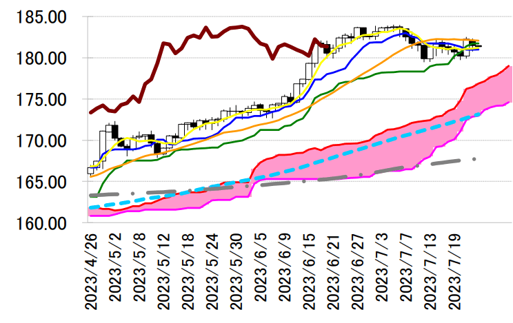 25-26 日の FOMC では、一連の引き締めサイクルで 11 回目の利上げ(+0.25%⇒FF 金利誘導目標 5.25-50%)が確実視されており、注目ポイントは、年末に向けた残り 3 回(9 月、11 月、12 月)の FOMC で 12 回目の利上げ(+0.25%)が再強調されるか否かとなる。