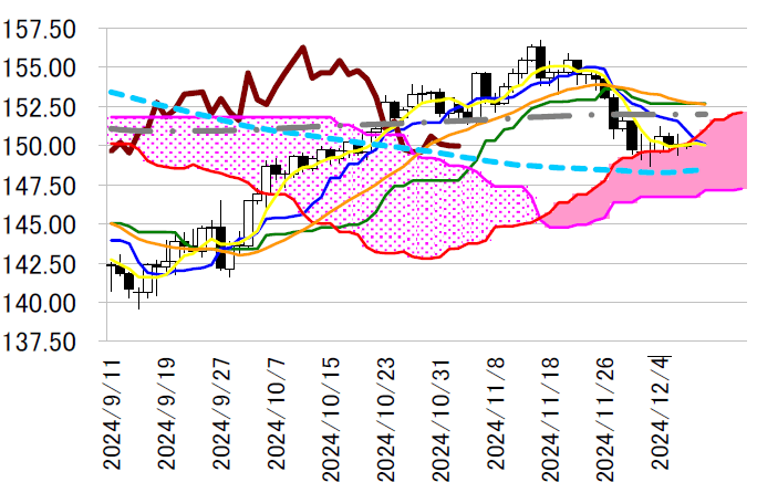 ドル円の一目均衡表でのテクニカル分析では、攻防の分岐点である雲の上限150.11円付近で推移して いることで、雲が支持帯として機能するのか、それとも雲の中へ入っていくのか、今後の注目ポイントと なっている。