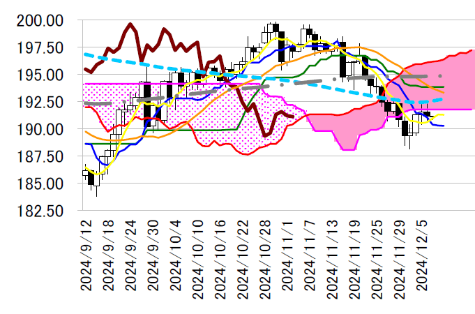 陰線引け。転換線は基準線を下回り、遅行スパンは実線を