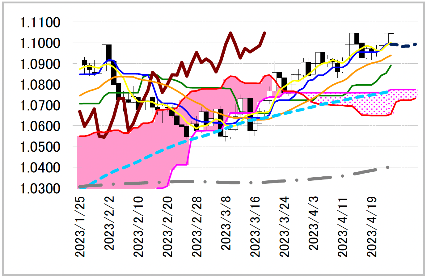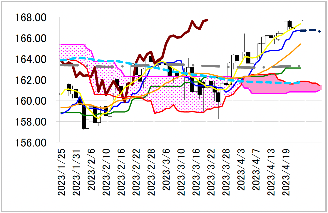 陽線引け。19 日につけた年初来高値167.97 円に迫る堅調な推移だった。上伸が期待され、調整安が入っても目先は一目均衡表・転換線166.69 円付近にとどまるとみる。ただ、まだじり高が続く見込みの転換線は、現状からすれば週後半
