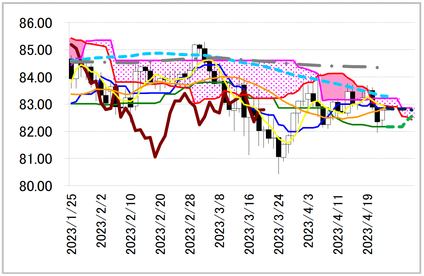 下影陽線引け。先週末に一目均衡表・雲のねじれ部分を上抜けきれず下振れた後を受け、雲を下回る水準から戻りを試す展開となった。雲の下限82.93 円が目先の重しで、さらに雲の上限83.21 円や83.29 円前後で推移する90 日移動平均線が抵抗となりそう。反落局面では、一目・基準線82.17 円前後が下げ渋りのポイントになるだろう。