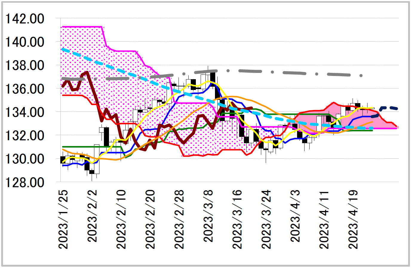ただ、買い一巡後は上値が重くなった。米長期金利の低下に伴う円買い・ドル売りが入ったほか、4月米ダラス連銀製造業活動指数が▲23.4と前回の▲15.7から悪化し、予想の▲12.0を下回ったことが相場の重しとなり、一時134.23円付近まで下押しした。もっとも、同水準に位置する一目均衡表雲の上限がサポートとして働くと下げ止まった。
