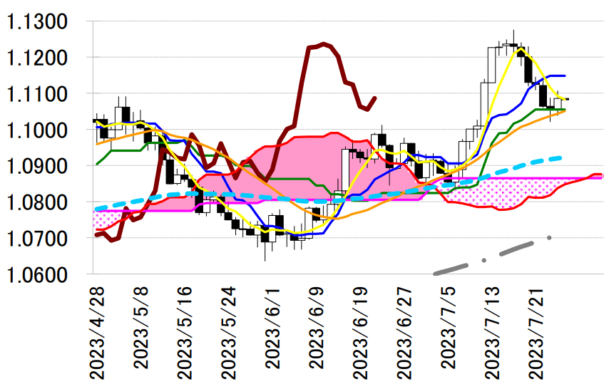 ただ、パウエル FRB 議長が FOMC 後の会見で「将来の利上げについてはデータを重視したアプローチを とる」「9 月利上げはデータ次第」「今後も会議ごとに決定を下していく」と発言すると、米金融引き締め 長期化観測が後退し米金利が低下。全般ドル売りが優勢となり、一時 139.93 円と日通し安値を更新した。 ユーロドルは 7 営業日ぶりに反発。終値は 1.1086 ドルと前営業日 NY 終値(1.1055 ドル)と比べて 0.0031 ドル程度のユーロ高水準だった。NY 時間に入るとしばらくはもみ合いの展開が続いていたが、パウエル FRB 議長が会見で次回会合での金利据え置きの可能性に言及すると、米金利の低下とともにドル売りが優 勢となった。4 時過ぎには一時 1.1107 ドルと日通し高値を更新した。