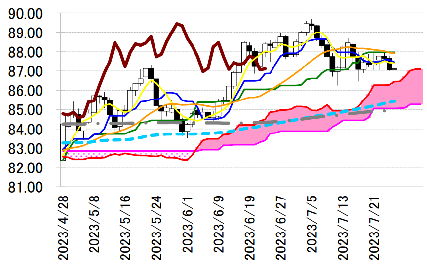 り、続落の可能性が示唆されている。 本日は、転換線 87.45 円を念頭に置き、基準線を抵抗に戻