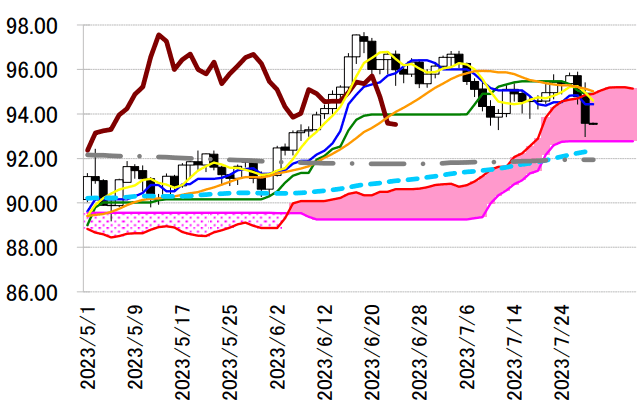 大陰線引け。雲の中に入り込み水準を下げ、転換線は基準線を下回り、遅行スパンは実線を下回っているため売りシグナルが優勢な展開。2 手連続陰線で転換線を下回って引けており、続落の可能性が示唆されている。 本日は 94 円半ばの転換線を抵抗に戻り売りスタンスで臨み、同線を上抜けた場合は手仕舞い。92 円後半の雲の下限が下サイドでは意識される。