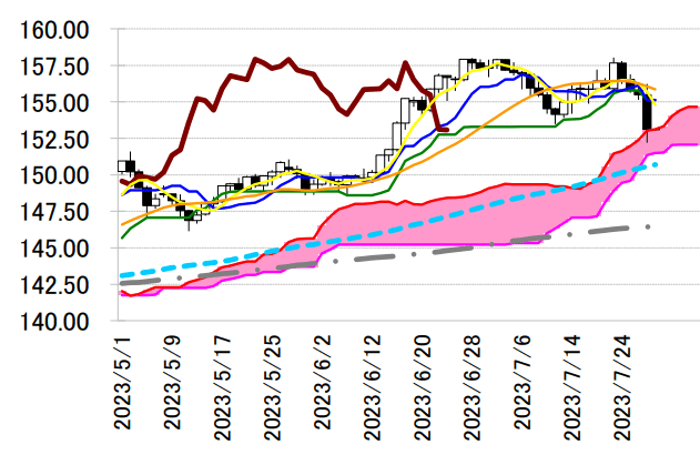 大陰線引け。転換線は基準線と同値、遅行スパンは実線を下回り、僅かに雲の上で引けた。4 手連続陰線で一時雲の中へ突入したものの、下影を伸ばして雲の上限まで持ち直している。ただし転換線を大幅に下回って引けており、下落圧力は高まったままか。 本日は雲の上限 153.12 円を念頭に置き、転換線・基準線を抵抗に戻り売りスタンスで臨み、同線を上抜けた場合は手仕舞い。なお雲の上限は来週以降も上昇する見込み。