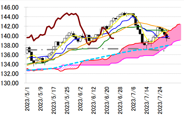 陰線引け。転換線は基準線を下回り、遅行スパンは実線を下回り、雲の中で引けているものの売りシグナルが優勢な展開。4 手連続陰線で転換線を下回って引けており、続落の可能性が示唆されている。本日は、転換線 139.83 円や 19・27 日安値 138.77 円を念頭に置いた取引に。140 円後半の 24 日安値を抵抗に戻り売りスタンスで臨み、同水準を上抜けた場合は手仕舞い。
