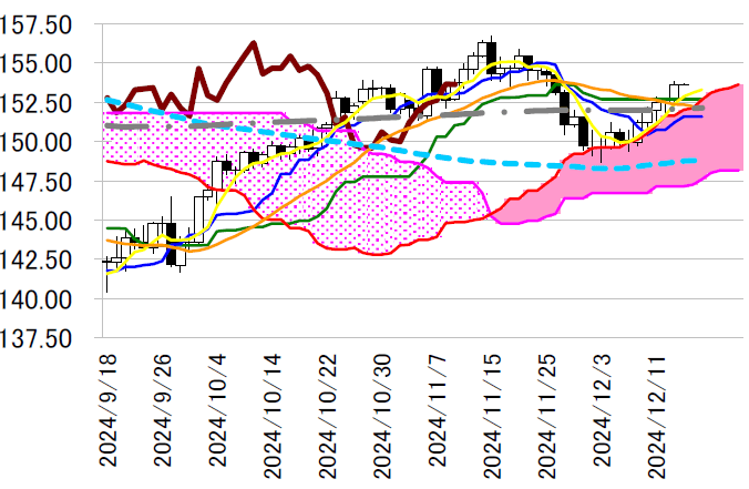 日足一目・基準線を超え、11 月26 日以来の高値圏153 円後