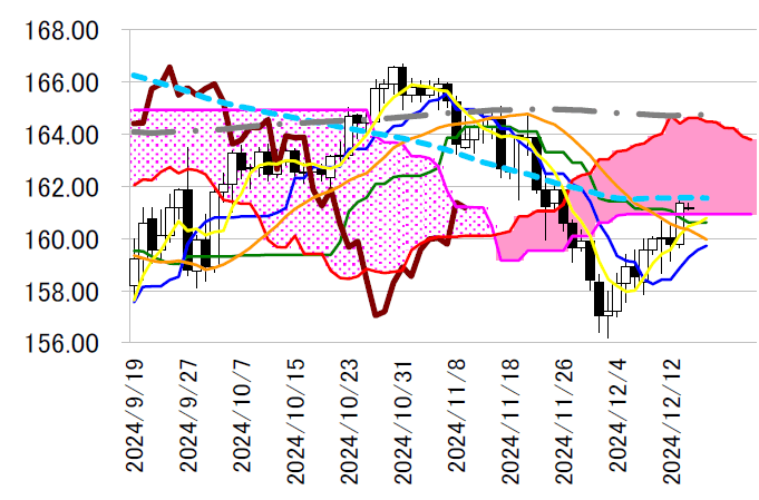 ドル円のテクニカル分析での上値の目処としては、11月15日の高値156.75円、そして7月3日の高 値161.95円から156.75円を経由する抵抗線(12/16:155.70円~12/20:155.50円)などが挙げられる。