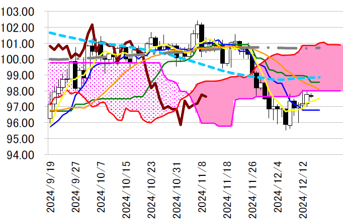 98 円半ばまで低下してきた基準線や98 円後半の90 日線が