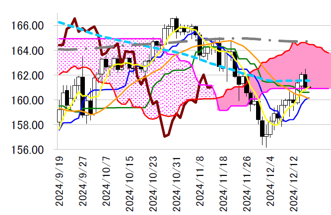 160 円後半まで反落。日足一目均衡表・雲を割り込んだとこ