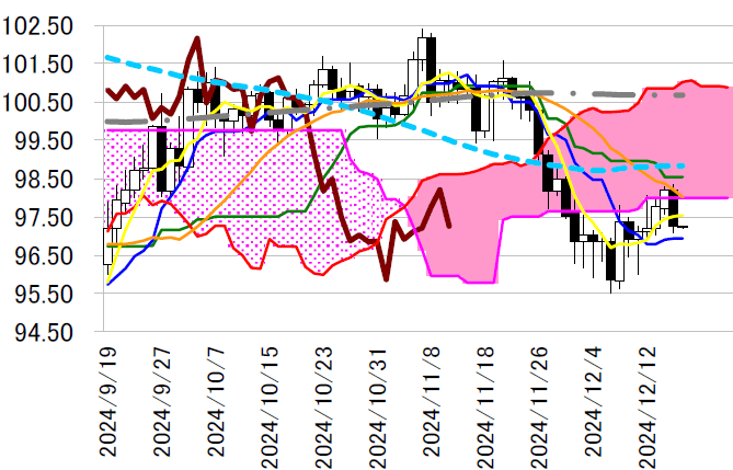 展開か。12 日安値の下96.94 円に転換線があり、同線を巡る