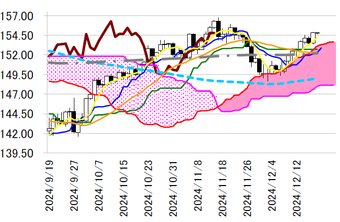 日足一目均衡表・雲の上限は153.10 円台まで値を上げ、