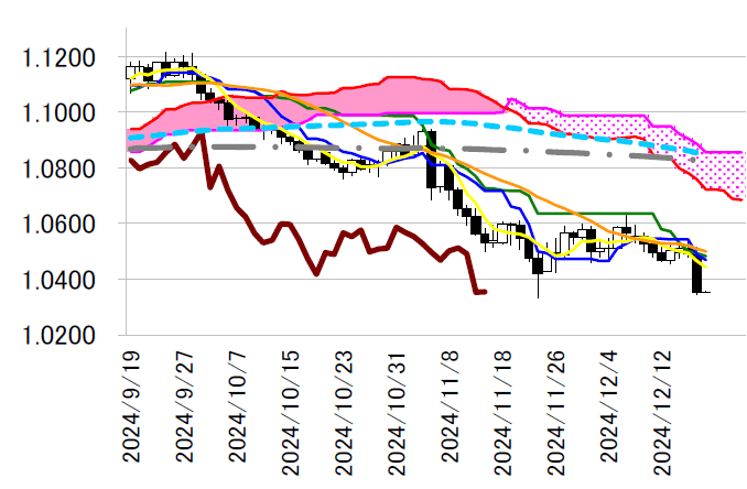 日足一目・基準線は1.04 ドル後半で下向き。昨日安値を