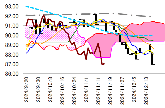 大陰線引け。88 円前半の日足一目・転換線を下抜けると下