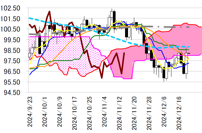 本日は98 円で横ばいの日足一目・雲の下限を巡る攻防が