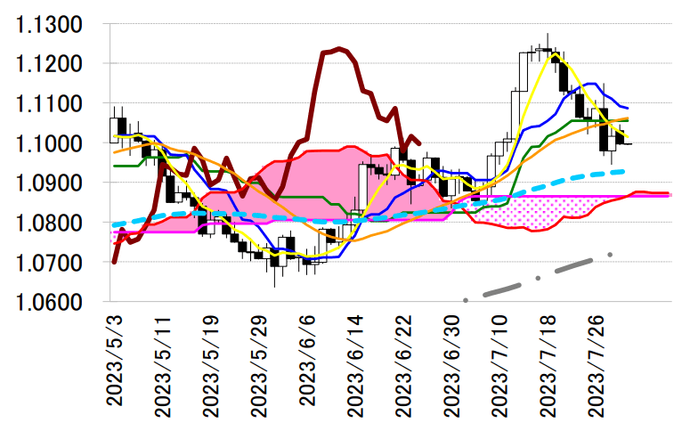 ユーロドルは反落。終値は 1.0997 ドルと前営業日 NY 終値(1.1016 ドル)と比べて 0.0019 ドル程度の ユーロ安水準だった。欧州時間発表の 7 月ユーロ圏消費者物価指数(HICP)コア速報値や 4-6 月期ユー ロ圏域内総生産(GDP)速報値が予想より強い内容となったことを受けてユーロ買い・ドル売りが先行。7 月米シカゴ PMI が予想を下回ったこともユーロ買い・ドル売りを促し、一時 1.1046 ドルと日通し高値を 更新した。
