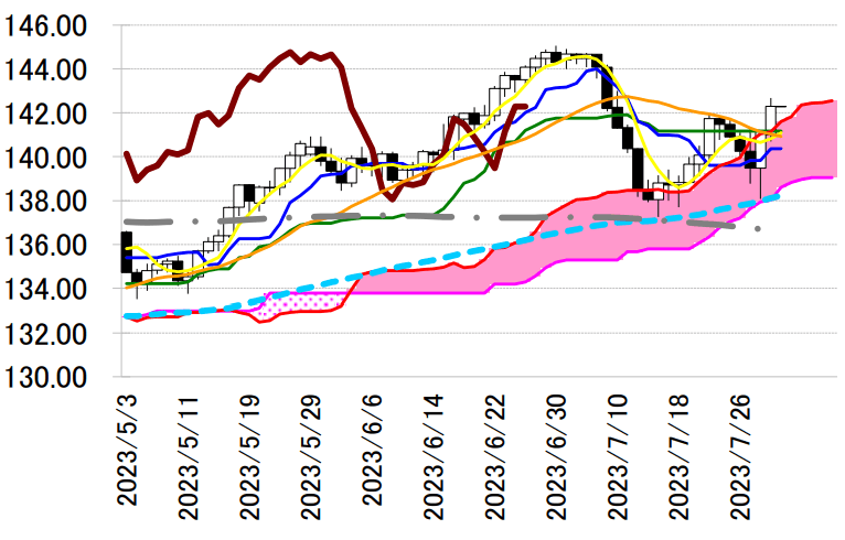 今週のドル円は、米 7 月雇用統計が堅調な労働市場を示唆した場合、6 月 30 日の高値 145.07 円を目指 す展開が予想される。しかし、145 円以上のドル円に対しては、神田財務官がボラティリティー抑制を名 目にしたドル売り・円買い介入に踏み切る可能性があること、植田日銀総裁もイールドカーブコントロー ル(YCC)の柔軟化に為替市場のボラティリティー抑制を挙げていたことで、本邦通貨当局による円安阻 止の姿勢を見極めることになるのかもしれない。